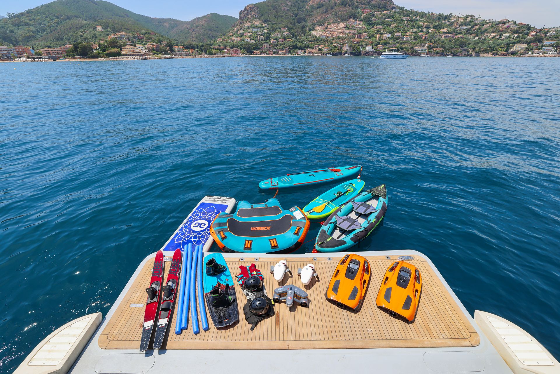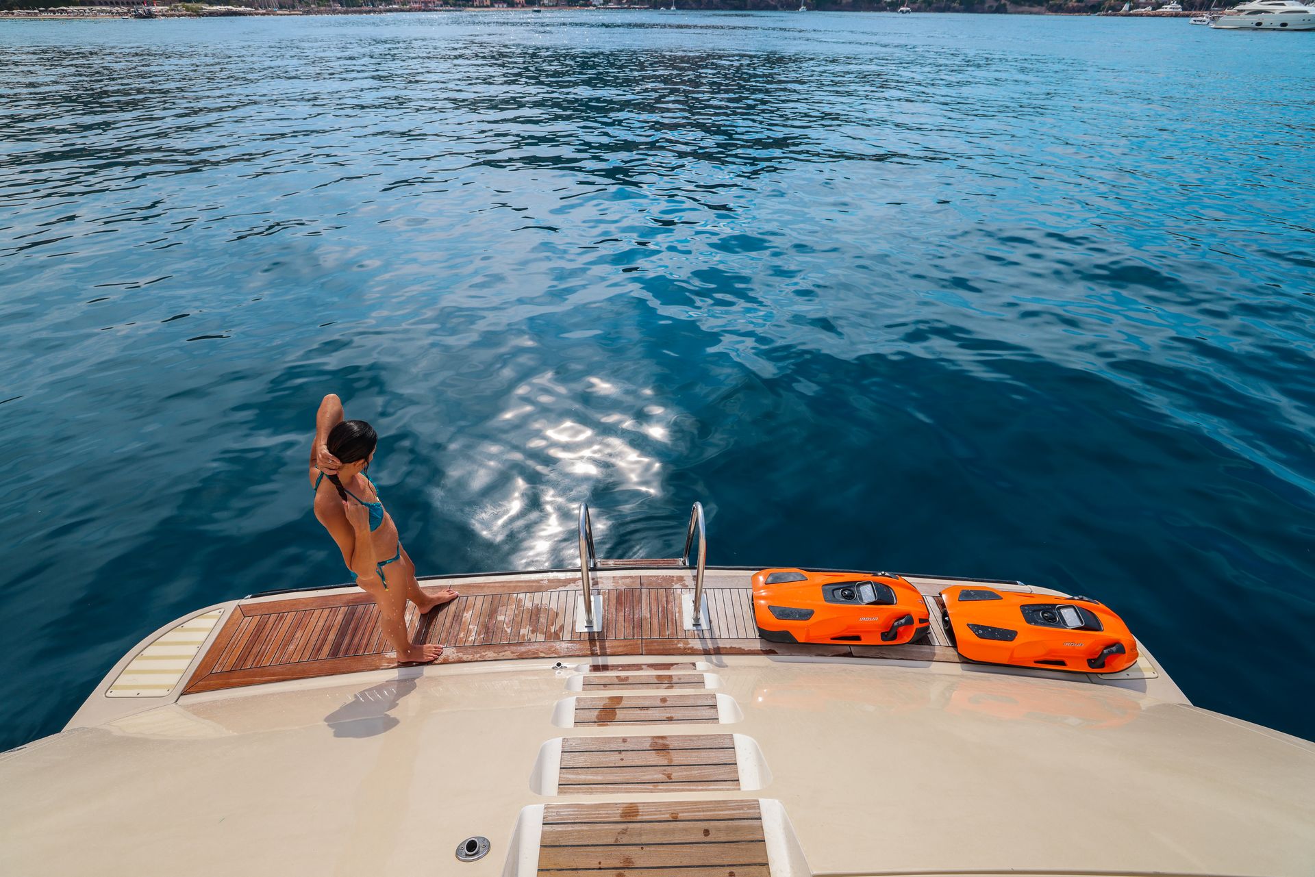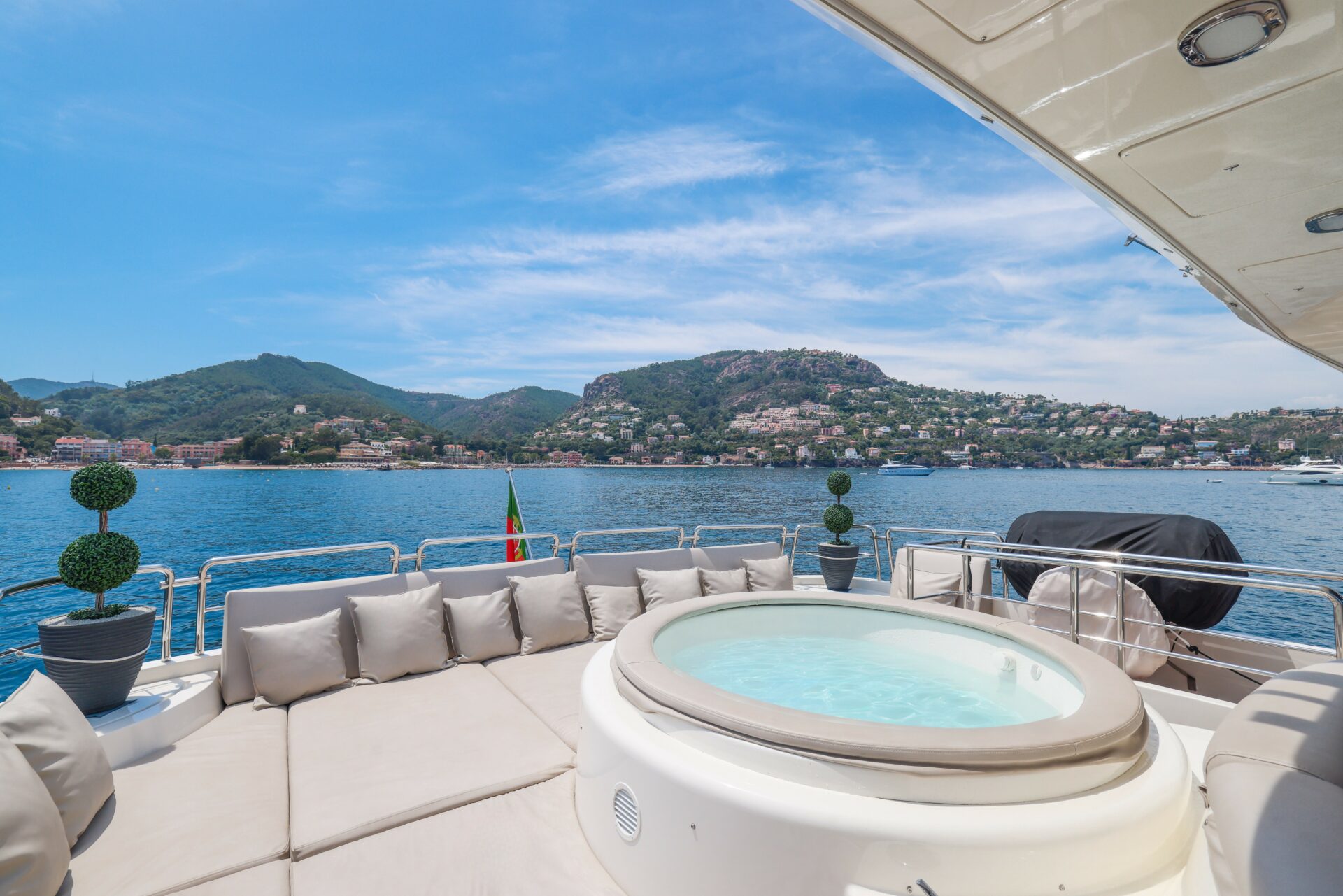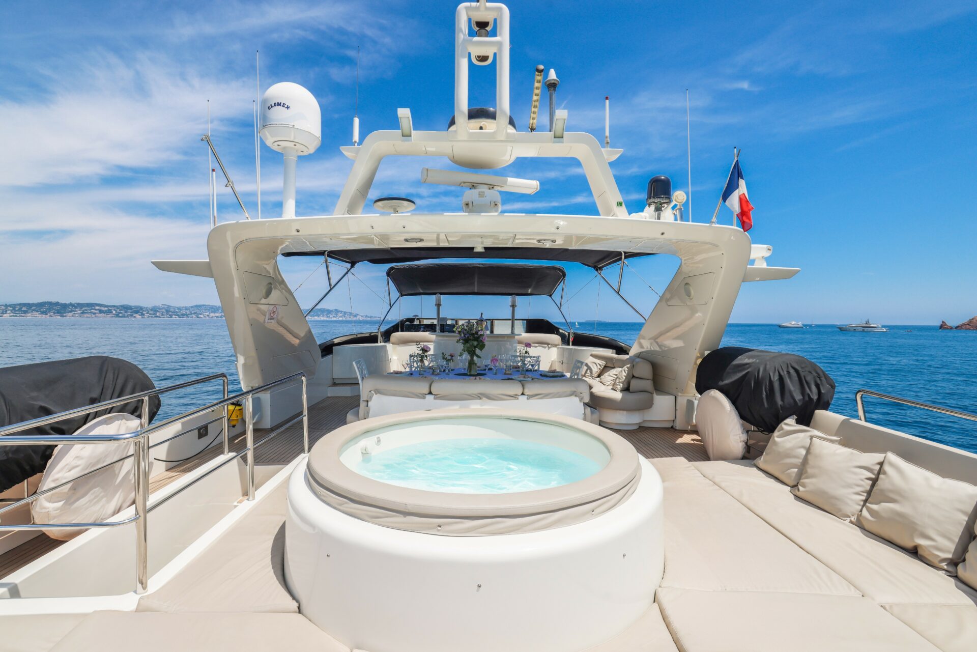 Built in 1999 by Azimut and refitted in 2024, this impressive 30 meter vessel is the perfect choice for those looking for an unforgettable charter experience. Her layout is the perfectly thought out to enjoy a day out a sea. Relax in the upper deck jacuzzi or soak up the sun from her sunbeds on the bow, sip on a cocktail at one of the many seated table areas, go for a seabob adventure at sea; options are endless!