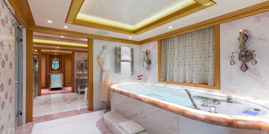 Charter guests aboard are greeted by the vast elegant main saloon, boasting two magnificent walls of back-lit amethyst, which is the first thing to notice and feel. The interior of the ultra-luxurious yacht SOLANDGE exudes elegance, luxury and opulence, as you walk through the beautiful wooden floors with borders of honey onyx stone and gold leaf ceilings with Schonbeck chandeliers dripping with amethyst rose quartz crystals.